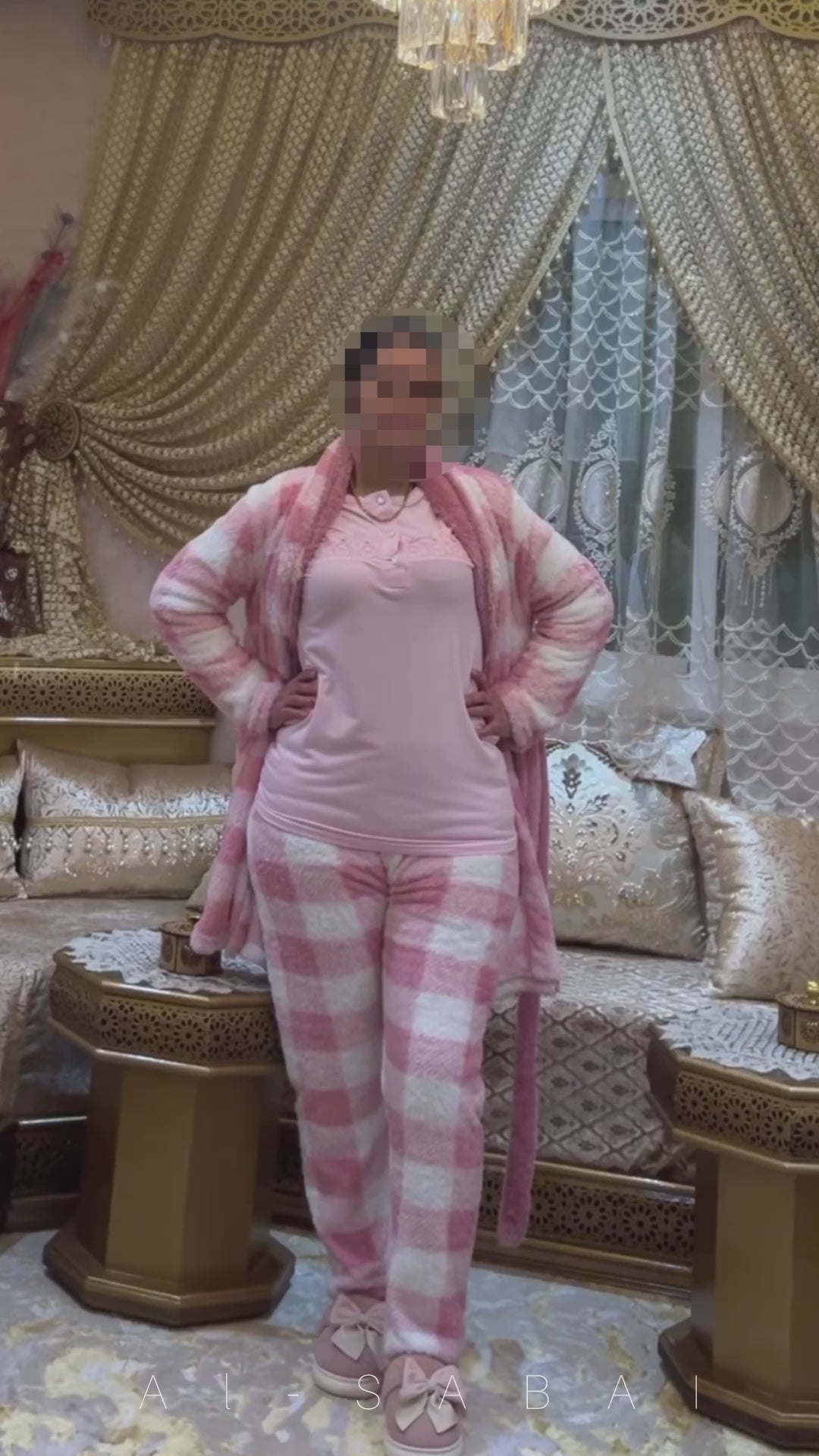 Robe : Une longue et douce robe d'extérieur avec le même motif à carreaux, dotée d'une ceinture pour la nouer autour de la taille